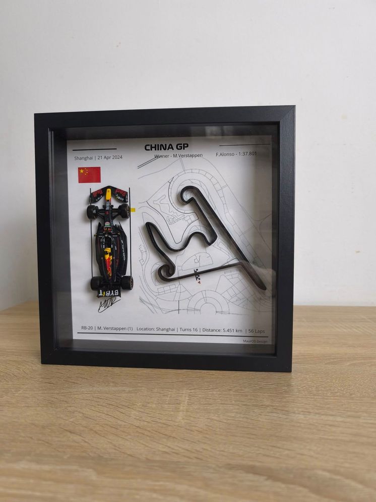China GP zidni okvir donosi jedinstvenu 3D interpretaciju kultne staze u Šangaju, prepoznatljive po svojim dugim zavojima i tehničkim sekcijama. Ručno izrađeni elementi stvaraju moderan dekor koji svaki F1 entuzijast odmah prepoznaje. Idealan kao poklon kolekcionarima ili kao statement komad u uredu i domu.